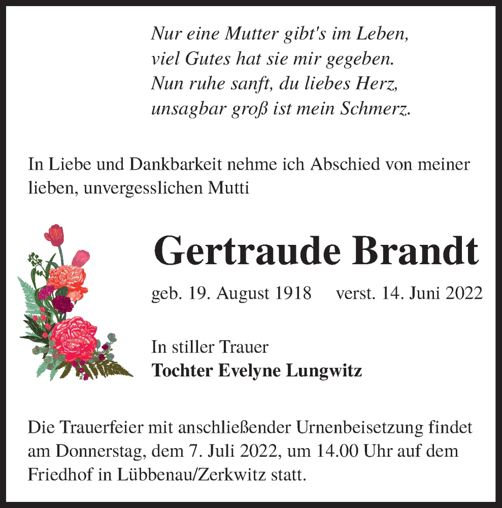 Hier finden Sie alle Traueranzeigen aus der Zeitung, die bisher für Gertraude Brandt erschienen sind. Weitere Traueranzeigen, die in der Zeitung erscheinen, werden hier ebenfalls aufgelistet