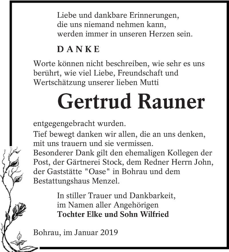 Hier finden Sie alle Traueranzeigen aus der Zeitung, die bisher für Gertrud Rauner erschienen sind. Weitere Traueranzeigen, die in der Zeitung erscheinen, werden hier ebenfalls aufgelistet