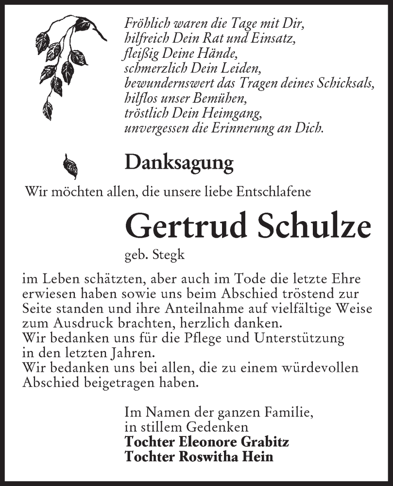 Hier finden Sie alle Traueranzeigen aus der Zeitung, die bisher für Gertrud Schulze erschienen sind. Weitere Traueranzeigen, die in der Zeitung erscheinen, werden hier ebenfalls aufgelistet