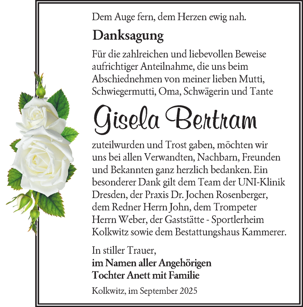 Hier finden Sie alle Traueranzeigen aus der Zeitung, die bisher für Gisela Bertram erschienen sind. Weitere Traueranzeigen, die in der Zeitung erscheinen, werden hier ebenfalls aufgelistet