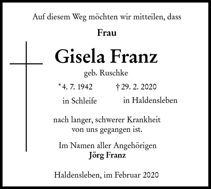 Hier finden Sie alle Traueranzeigen aus der Zeitung, die bisher für Gisela Franz erschienen sind. Weitere Traueranzeigen, die in der Zeitung erscheinen, werden hier ebenfalls aufgelistet