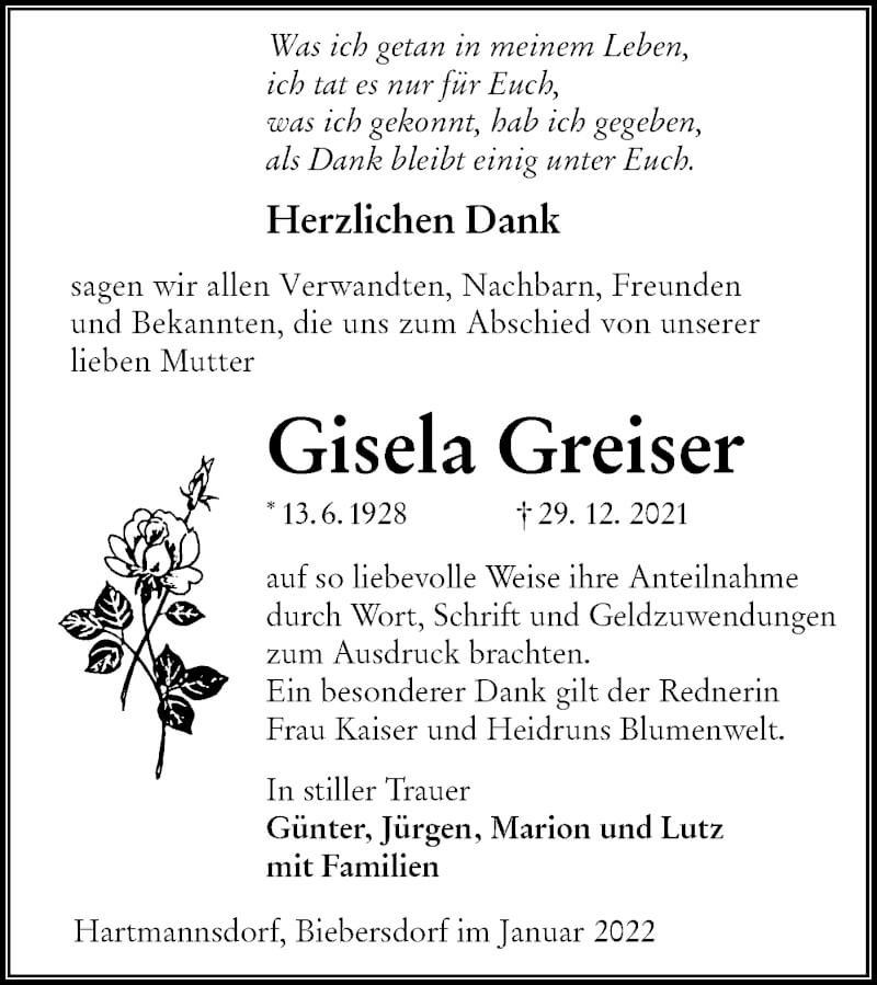 Hier finden Sie alle Traueranzeigen aus der Zeitung, die bisher für Gisela Greiser erschienen sind. Weitere Traueranzeigen, die in der Zeitung erscheinen, werden hier ebenfalls aufgelistet