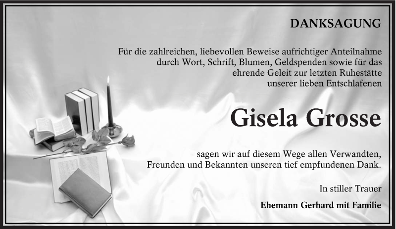 Hier finden Sie alle Traueranzeigen aus der Zeitung, die bisher für Gisela Grosse erschienen sind. Weitere Traueranzeigen, die in der Zeitung erscheinen, werden hier ebenfalls aufgelistet