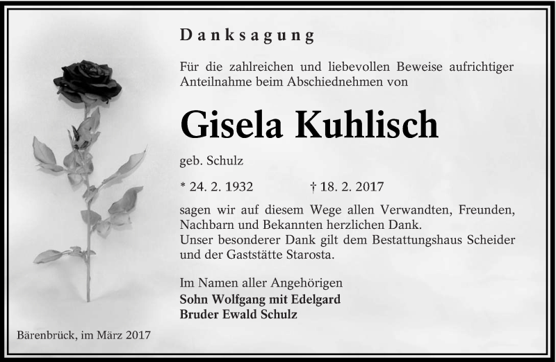 Hier finden Sie alle Traueranzeigen aus der Zeitung, die bisher für Gisela Kuhlisch erschienen sind. Weitere Traueranzeigen, die in der Zeitung erscheinen, werden hier ebenfalls aufgelistet