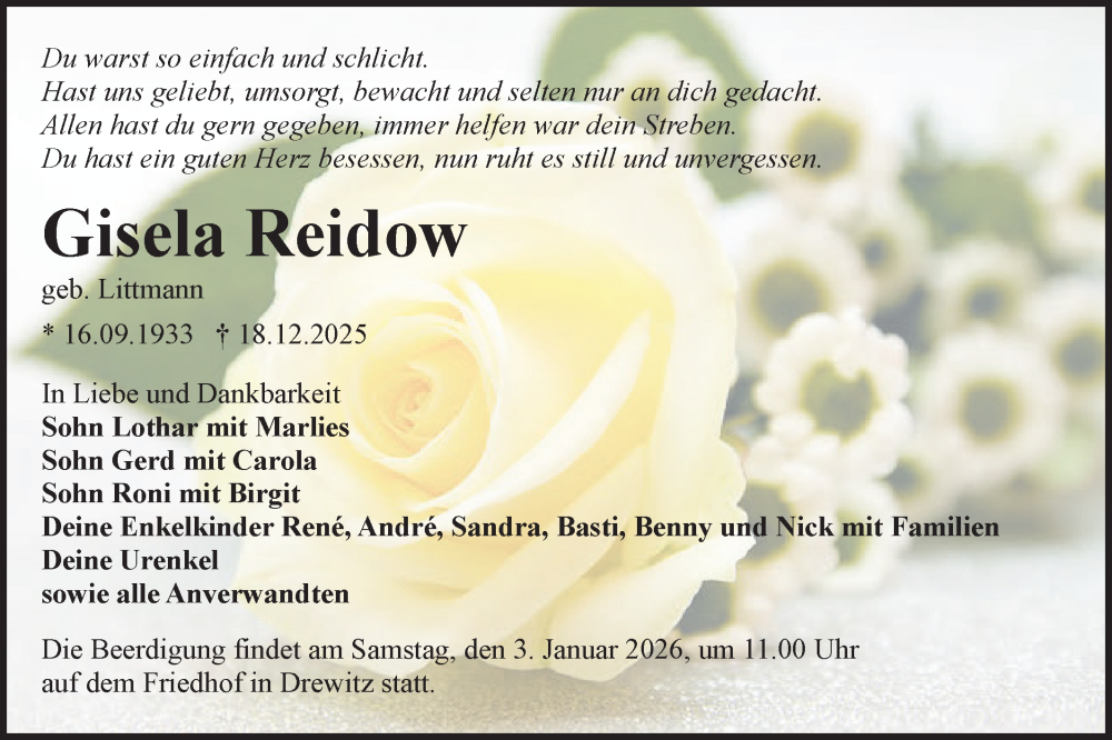 Hier finden Sie alle Traueranzeigen aus der Zeitung, die bisher für Gisela Reidow erschienen sind. Weitere Traueranzeigen, die in der Zeitung erscheinen, werden hier ebenfalls aufgelistet