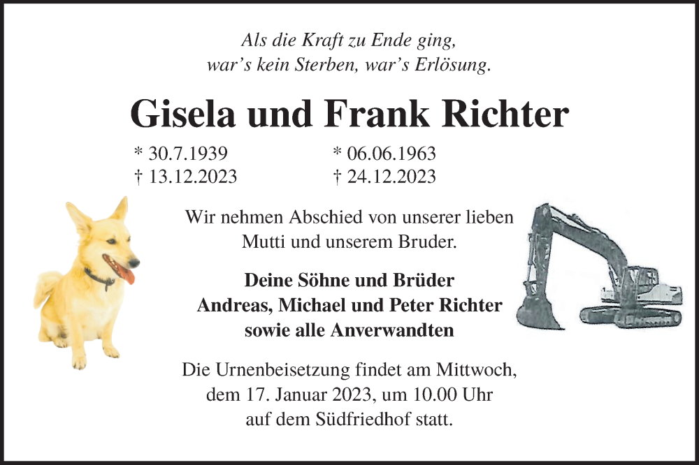 Hier finden Sie alle Traueranzeigen aus der Zeitung, die bisher für Gisela und Frank Richter erschienen sind. Weitere Traueranzeigen, die in der Zeitung erscheinen, werden hier ebenfalls aufgelistet