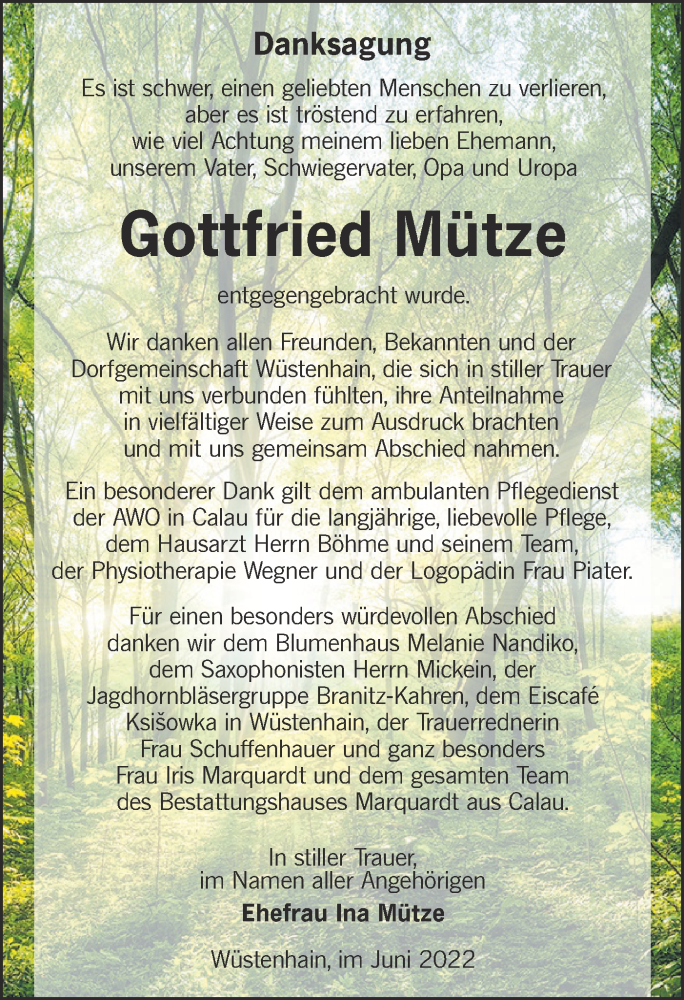Hier finden Sie alle Traueranzeigen aus der Zeitung, die bisher für Gottfried Mütze erschienen sind. Weitere Traueranzeigen, die in der Zeitung erscheinen, werden hier ebenfalls aufgelistet
