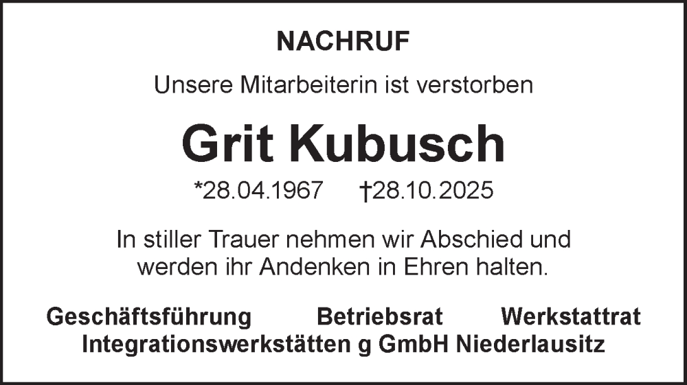 Hier finden Sie alle Traueranzeigen aus der Zeitung, die bisher für Grit Kubusch erschienen sind. Weitere Traueranzeigen, die in der Zeitung erscheinen, werden hier ebenfalls aufgelistet