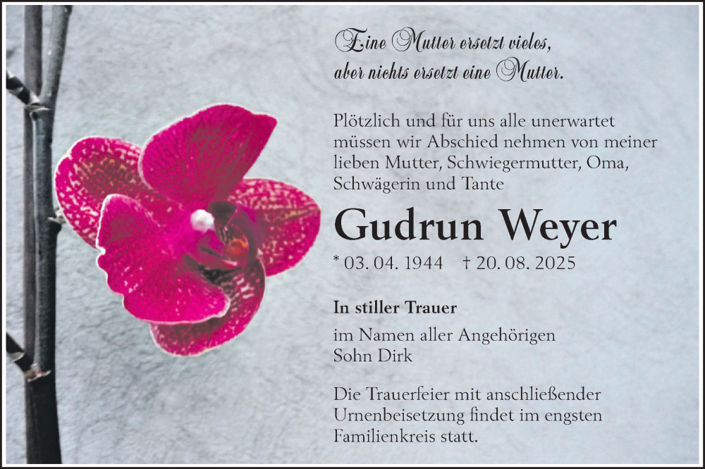 Hier finden Sie alle Traueranzeigen aus der Zeitung, die bisher für Gudrun Weyer erschienen sind. Weitere Traueranzeigen, die in der Zeitung erscheinen, werden hier ebenfalls aufgelistet