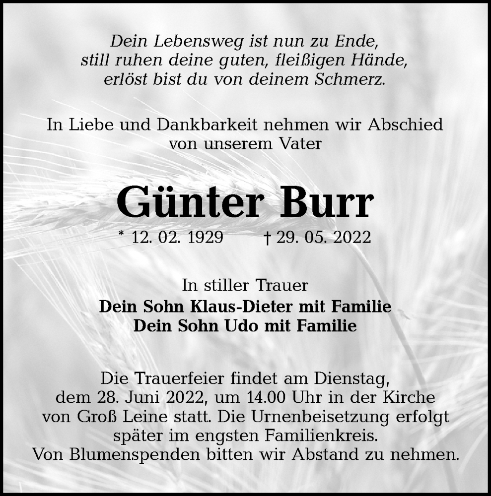 Hier finden Sie alle Traueranzeigen aus der Zeitung, die bisher für Günter Burr erschienen sind. Weitere Traueranzeigen, die in der Zeitung erscheinen, werden hier ebenfalls aufgelistet