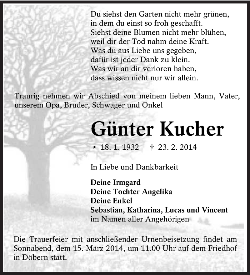 Hier finden Sie alle Traueranzeigen aus der Zeitung, die bisher für Günter Kucher erschienen sind. Weitere Traueranzeigen, die in der Zeitung erscheinen, werden hier ebenfalls aufgelistet