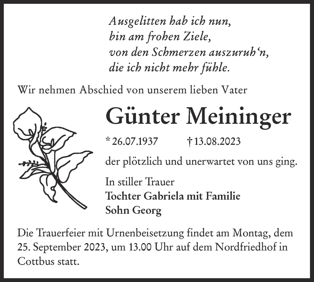 Hier finden Sie alle Traueranzeigen aus der Zeitung, die bisher für Günter Meininger erschienen sind. Weitere Traueranzeigen, die in der Zeitung erscheinen, werden hier ebenfalls aufgelistet