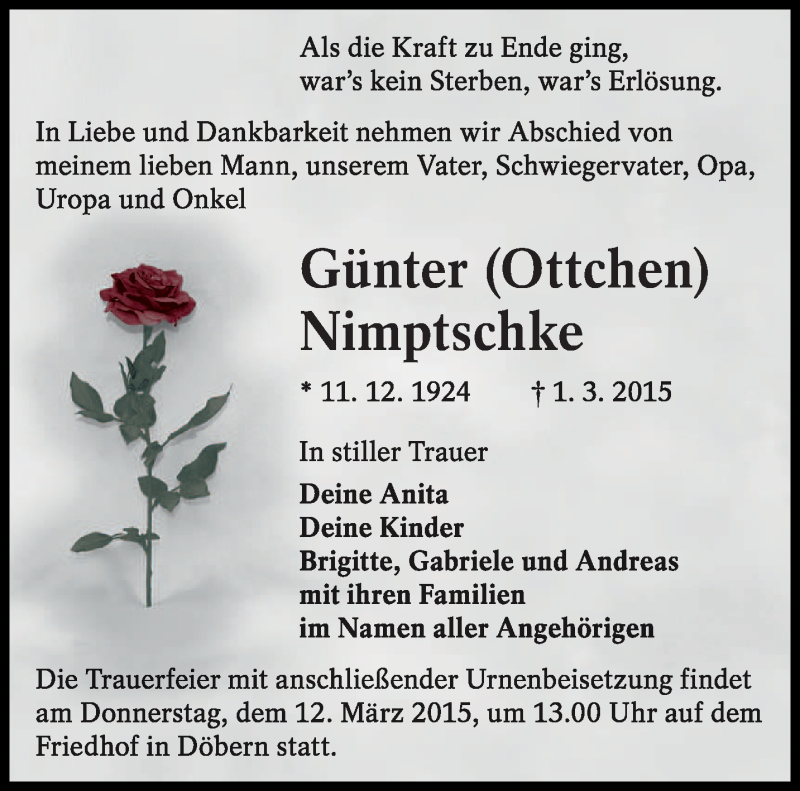 Hier finden Sie alle Traueranzeigen aus der Zeitung, die bisher für Günter Nimptschke erschienen sind. Weitere Traueranzeigen, die in der Zeitung erscheinen, werden hier ebenfalls aufgelistet