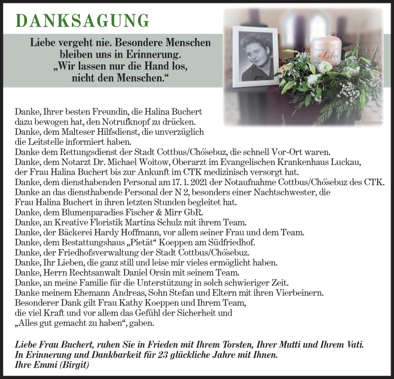 Hier finden Sie alle Traueranzeigen aus der Zeitung, die bisher für Halina Buchert erschienen sind. Weitere Traueranzeigen, die in der Zeitung erscheinen, werden hier ebenfalls aufgelistet