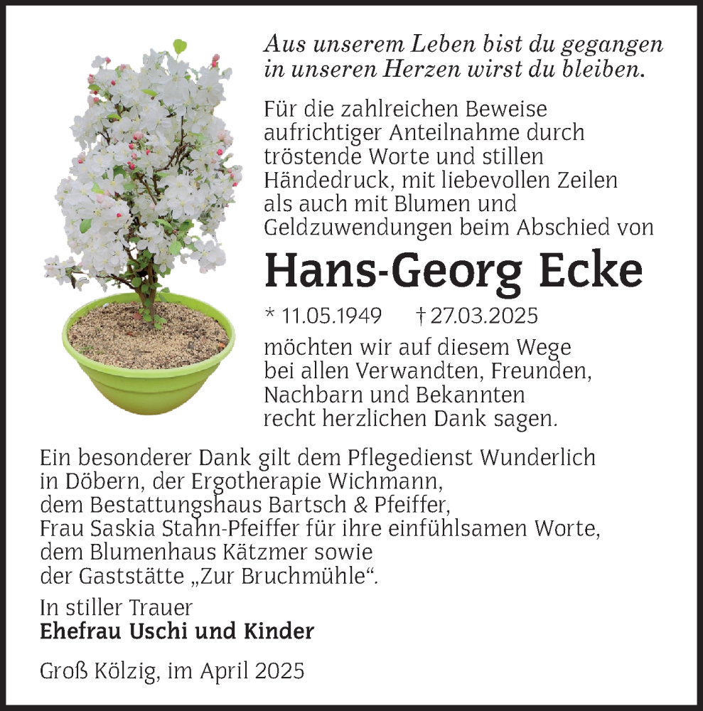 Hier finden Sie alle Traueranzeigen aus der Zeitung, die bisher für Hans-Georg Ecke erschienen sind. Weitere Traueranzeigen, die in der Zeitung erscheinen, werden hier ebenfalls aufgelistet