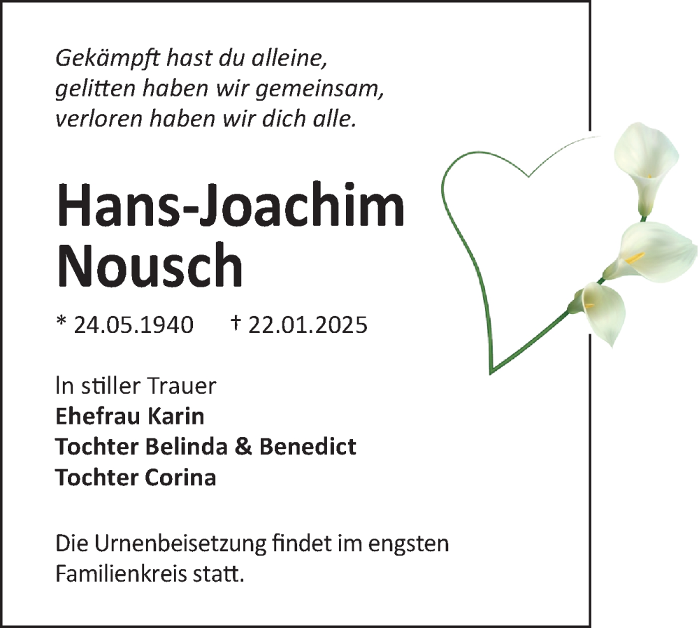 Hier finden Sie alle Traueranzeigen aus der Zeitung, die bisher für Hans-Joachim Nousch erschienen sind. Weitere Traueranzeigen, die in der Zeitung erscheinen, werden hier ebenfalls aufgelistet