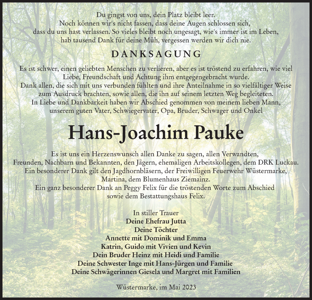Hier finden Sie alle Traueranzeigen aus der Zeitung, die bisher für Hans-Joachim Pauke erschienen sind. Weitere Traueranzeigen, die in der Zeitung erscheinen, werden hier ebenfalls aufgelistet