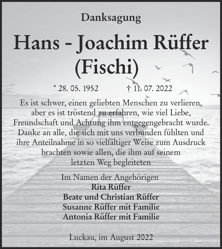 Hier finden Sie alle Traueranzeigen aus der Zeitung, die bisher für Hans-Joachim Rüffer erschienen sind. Weitere Traueranzeigen, die in der Zeitung erscheinen, werden hier ebenfalls aufgelistet
