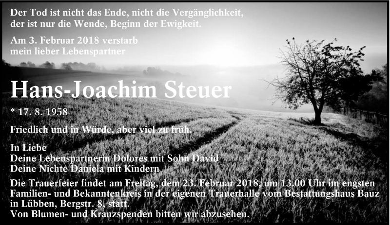 Hier finden Sie alle Traueranzeigen aus der Zeitung, die bisher für Hans-Joachim Steue erschienen sind. Weitere Traueranzeigen, die in der Zeitung erscheinen, werden hier ebenfalls aufgelistet