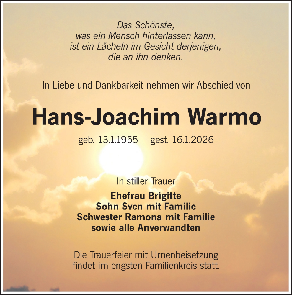 Hier finden Sie alle Traueranzeigen aus der Zeitung, die bisher für Hans-Joachim Warmo erschienen sind. Weitere Traueranzeigen, die in der Zeitung erscheinen, werden hier ebenfalls aufgelistet