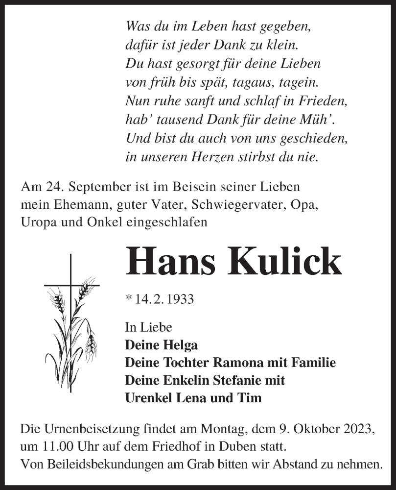 Hier finden Sie alle Traueranzeigen aus der Zeitung, die bisher für Hans Kulick erschienen sind. Weitere Traueranzeigen, die in der Zeitung erscheinen, werden hier ebenfalls aufgelistet