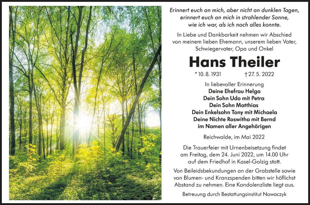 Hier finden Sie alle Traueranzeigen aus der Zeitung, die bisher für Hans Theiler erschienen sind. Weitere Traueranzeigen, die in der Zeitung erscheinen, werden hier ebenfalls aufgelistet