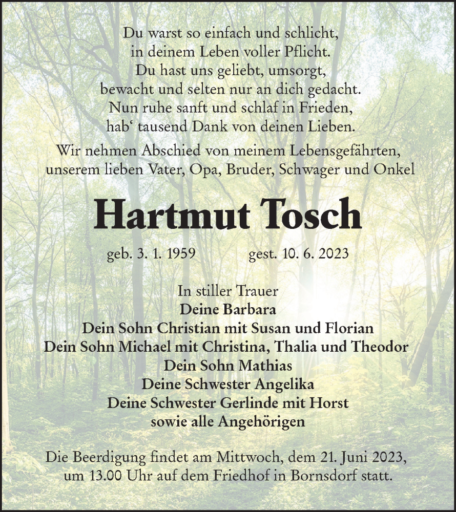 Hier finden Sie alle Traueranzeigen aus der Zeitung, die bisher für Hartmut Tosch erschienen sind. Weitere Traueranzeigen, die in der Zeitung erscheinen, werden hier ebenfalls aufgelistet