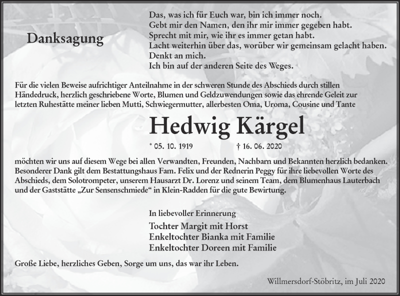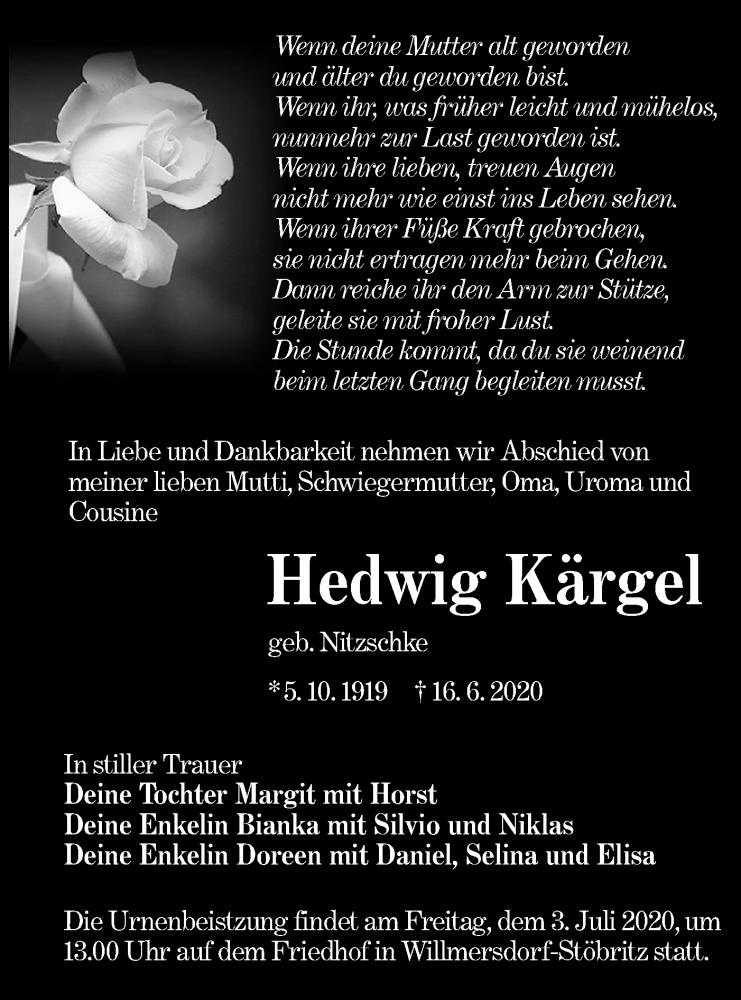 Hier finden Sie alle Traueranzeigen aus der Zeitung, die bisher für Hedwig Kärgel erschienen sind. Weitere Traueranzeigen, die in der Zeitung erscheinen, werden hier ebenfalls aufgelistet