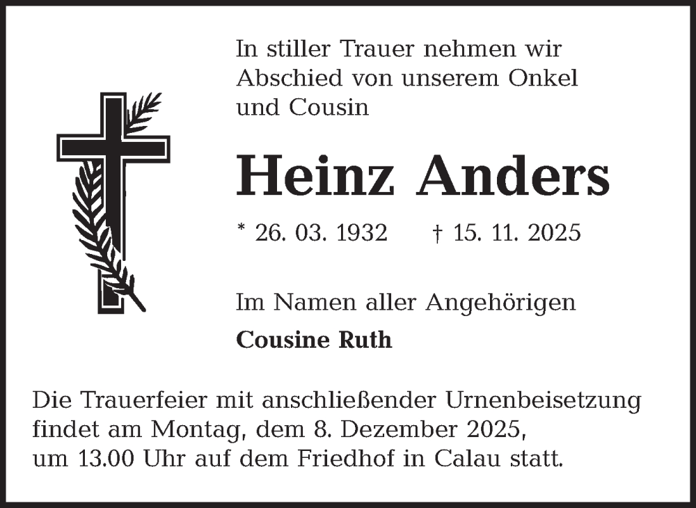 Hier finden Sie alle Traueranzeigen aus der Zeitung, die bisher für Heinz Anders erschienen sind. Weitere Traueranzeigen, die in der Zeitung erscheinen, werden hier ebenfalls aufgelistet