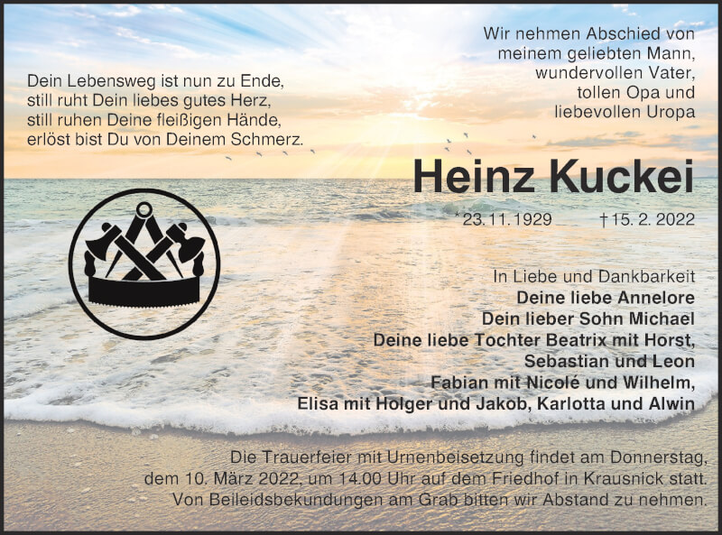 Hier finden Sie alle Traueranzeigen aus der Zeitung, die bisher für Heinz Kuckei erschienen sind. Weitere Traueranzeigen, die in der Zeitung erscheinen, werden hier ebenfalls aufgelistet