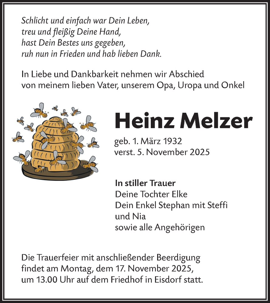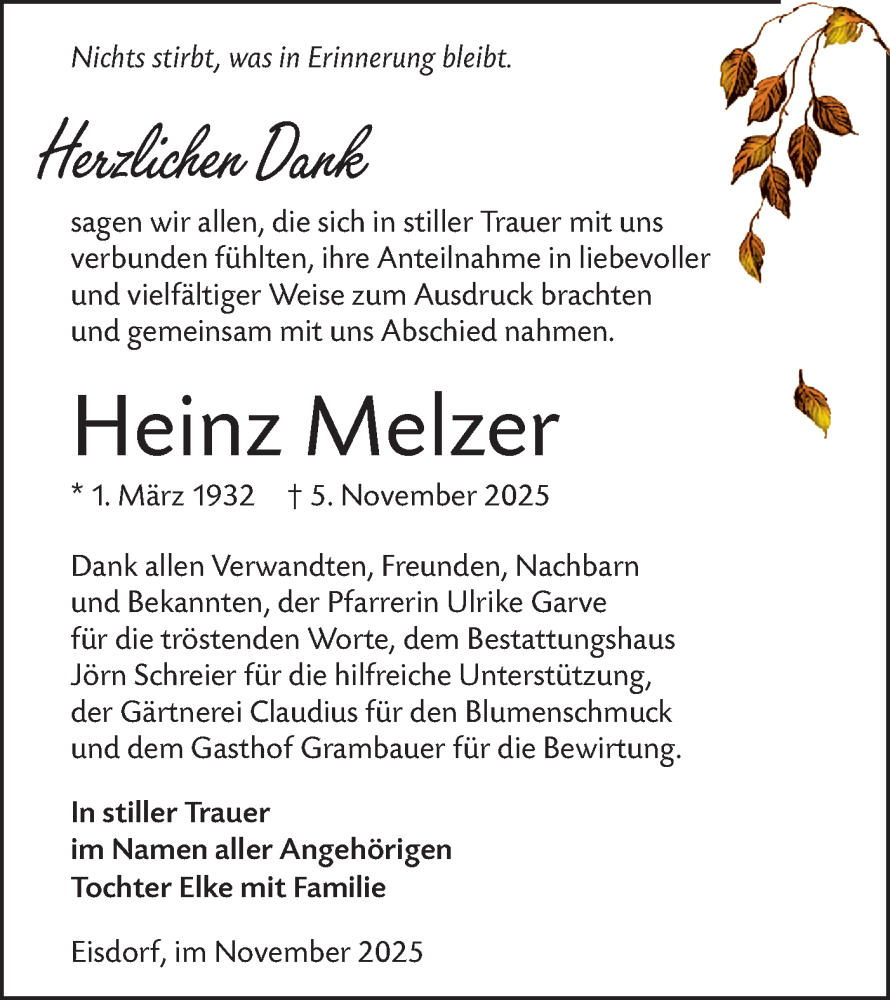 Hier finden Sie alle Traueranzeigen aus der Zeitung, die bisher für Heinz Melzer erschienen sind. Weitere Traueranzeigen, die in der Zeitung erscheinen, werden hier ebenfalls aufgelistet