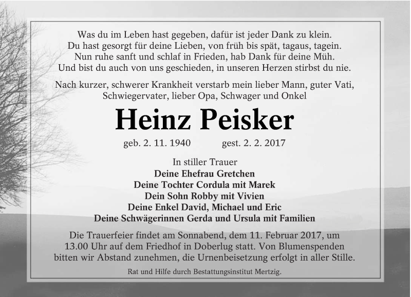 Hier finden Sie alle Traueranzeigen aus der Zeitung, die bisher für Heinz Peisker erschienen sind. Weitere Traueranzeigen, die in der Zeitung erscheinen, werden hier ebenfalls aufgelistet