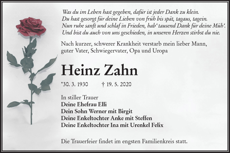 Hier finden Sie alle Traueranzeigen aus der Zeitung, die bisher für Heinz Zahn erschienen sind. Weitere Traueranzeigen, die in der Zeitung erscheinen, werden hier ebenfalls aufgelistet