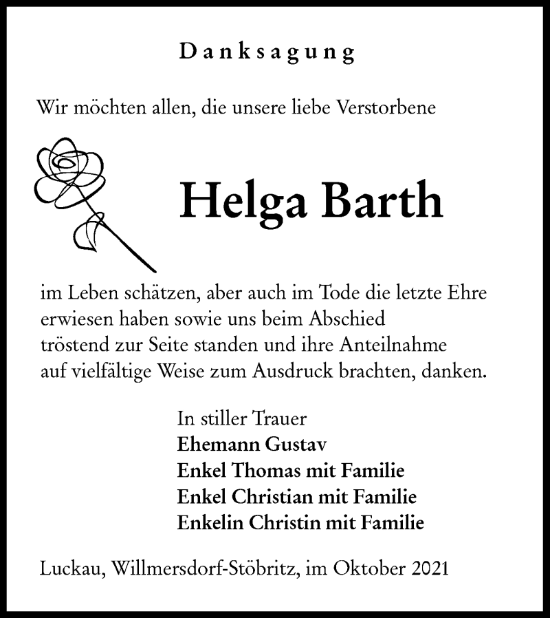 Hier finden Sie alle Traueranzeigen aus der Zeitung, die bisher für Helga Barth erschienen sind. Weitere Traueranzeigen, die in der Zeitung erscheinen, werden hier ebenfalls aufgelistet