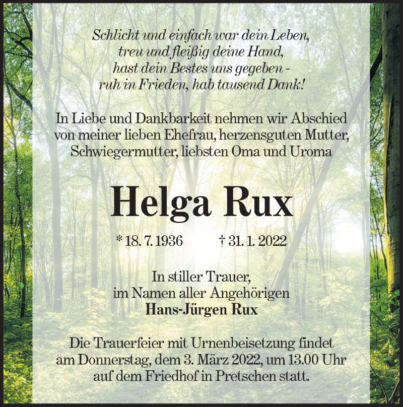 Hier finden Sie alle Traueranzeigen aus der Zeitung, die bisher für Helga Rux erschienen sind. Weitere Traueranzeigen, die in der Zeitung erscheinen, werden hier ebenfalls aufgelistet