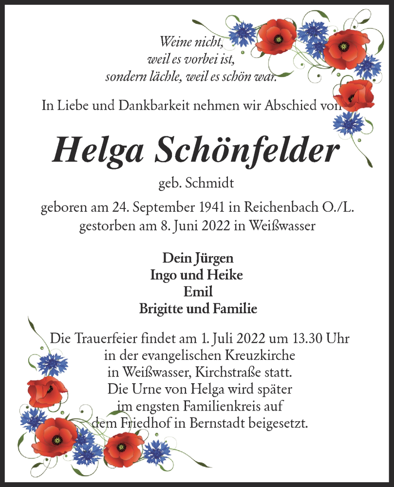 Hier finden Sie alle Traueranzeigen aus der Zeitung, die bisher für Helga Schönfelder erschienen sind. Weitere Traueranzeigen, die in der Zeitung erscheinen, werden hier ebenfalls aufgelistet