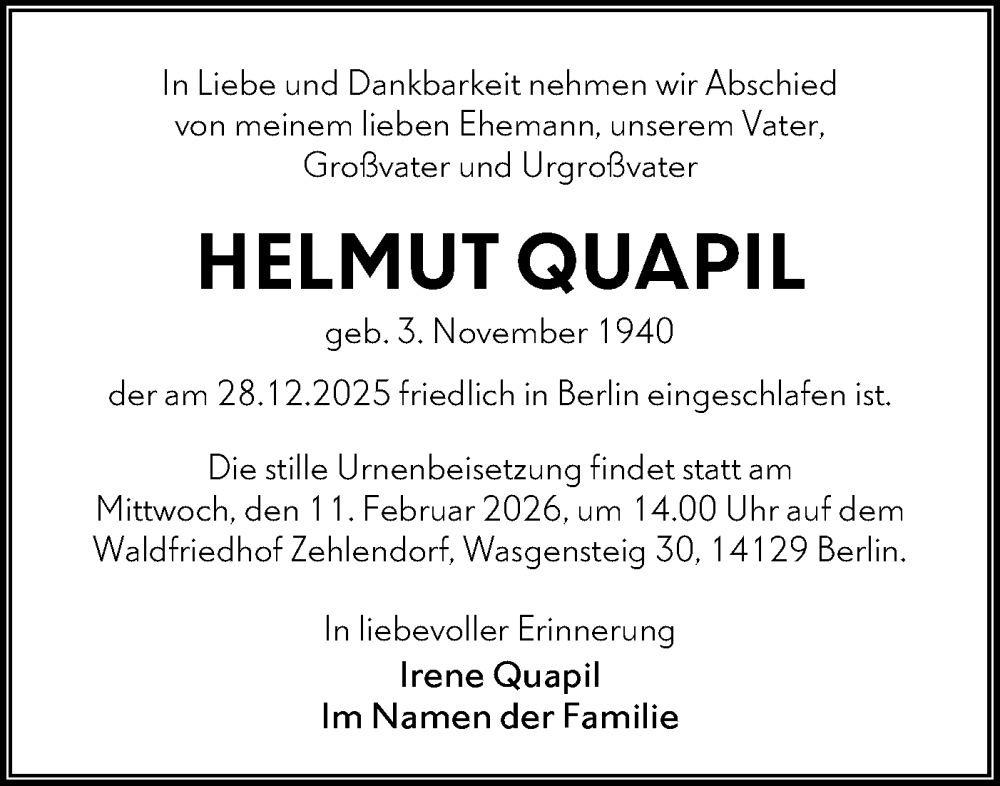 Hier finden Sie alle Traueranzeigen aus der Zeitung, die bisher für Helmut Quapil erschienen sind. Weitere Traueranzeigen, die in der Zeitung erscheinen, werden hier ebenfalls aufgelistet
