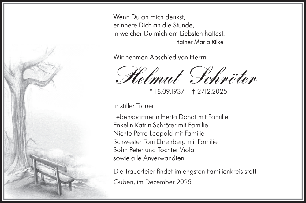Hier finden Sie alle Traueranzeigen aus der Zeitung, die bisher für Helmut Schröter erschienen sind. Weitere Traueranzeigen, die in der Zeitung erscheinen, werden hier ebenfalls aufgelistet