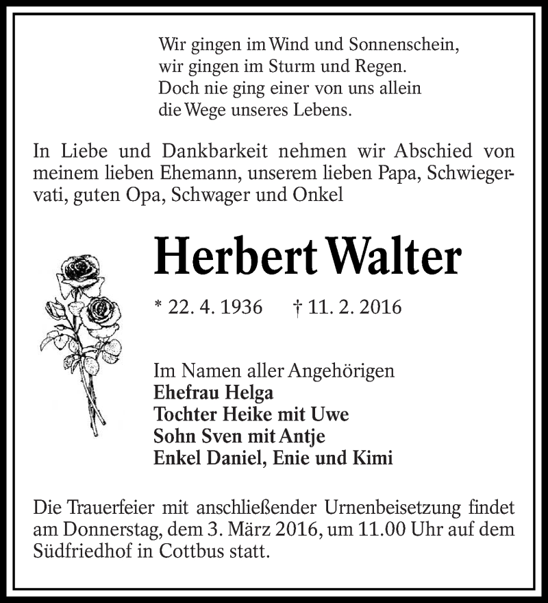 Hier finden Sie alle Traueranzeigen aus der Zeitung, die bisher für Herbert Walter erschienen sind. Weitere Traueranzeigen, die in der Zeitung erscheinen, werden hier ebenfalls aufgelistet
