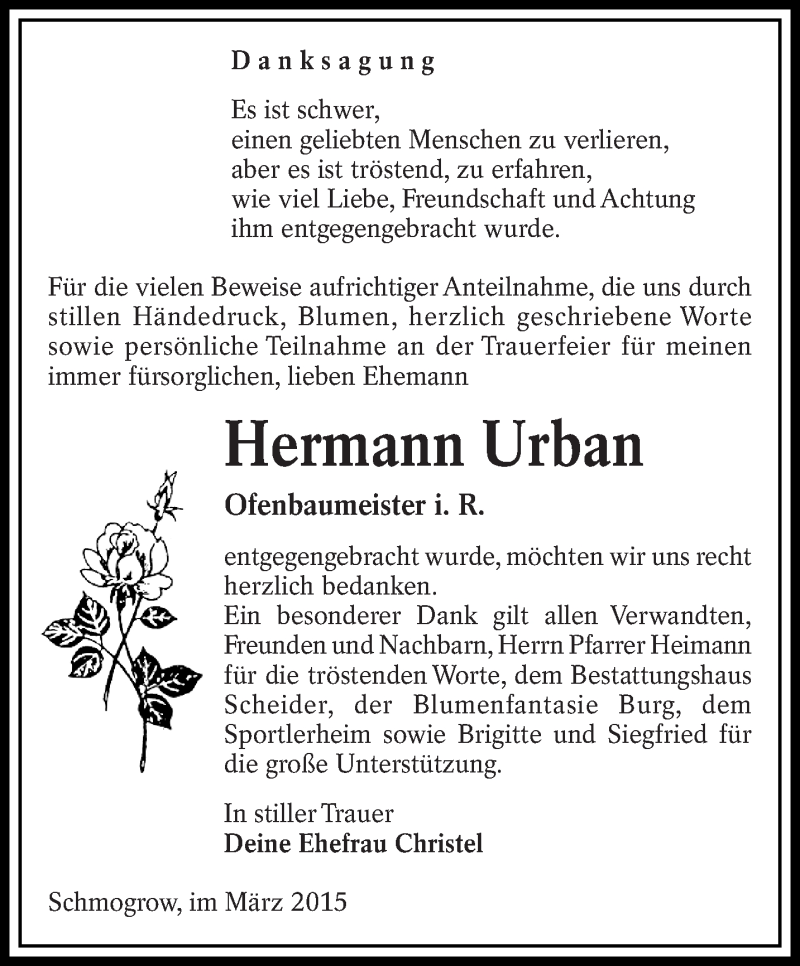 Hier finden Sie alle Traueranzeigen aus der Zeitung, die bisher für Hermann Urban erschienen sind. Weitere Traueranzeigen, die in der Zeitung erscheinen, werden hier ebenfalls aufgelistet