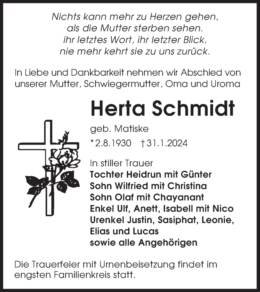 Hier finden Sie alle Traueranzeigen aus der Zeitung, die bisher für Herta Schmidt erschienen sind. Weitere Traueranzeigen, die in der Zeitung erscheinen, werden hier ebenfalls aufgelistet