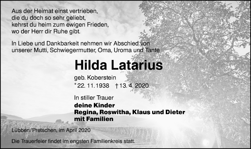 Hier finden Sie alle Traueranzeigen aus der Zeitung, die bisher für Hilda Latarius erschienen sind. Weitere Traueranzeigen, die in der Zeitung erscheinen, werden hier ebenfalls aufgelistet