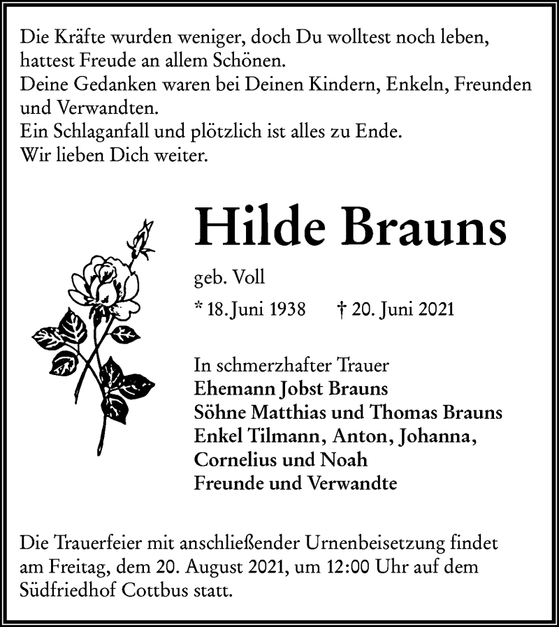 Hier finden Sie alle Traueranzeigen aus der Zeitung, die bisher für Hilde Brauns erschienen sind. Weitere Traueranzeigen, die in der Zeitung erscheinen, werden hier ebenfalls aufgelistet