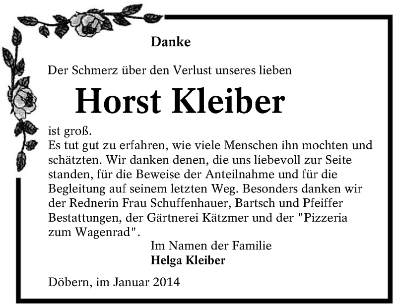 Hier finden Sie alle Traueranzeigen aus der Zeitung, die bisher für Horst Kleiber erschienen sind. Weitere Traueranzeigen, die in der Zeitung erscheinen, werden hier ebenfalls aufgelistet