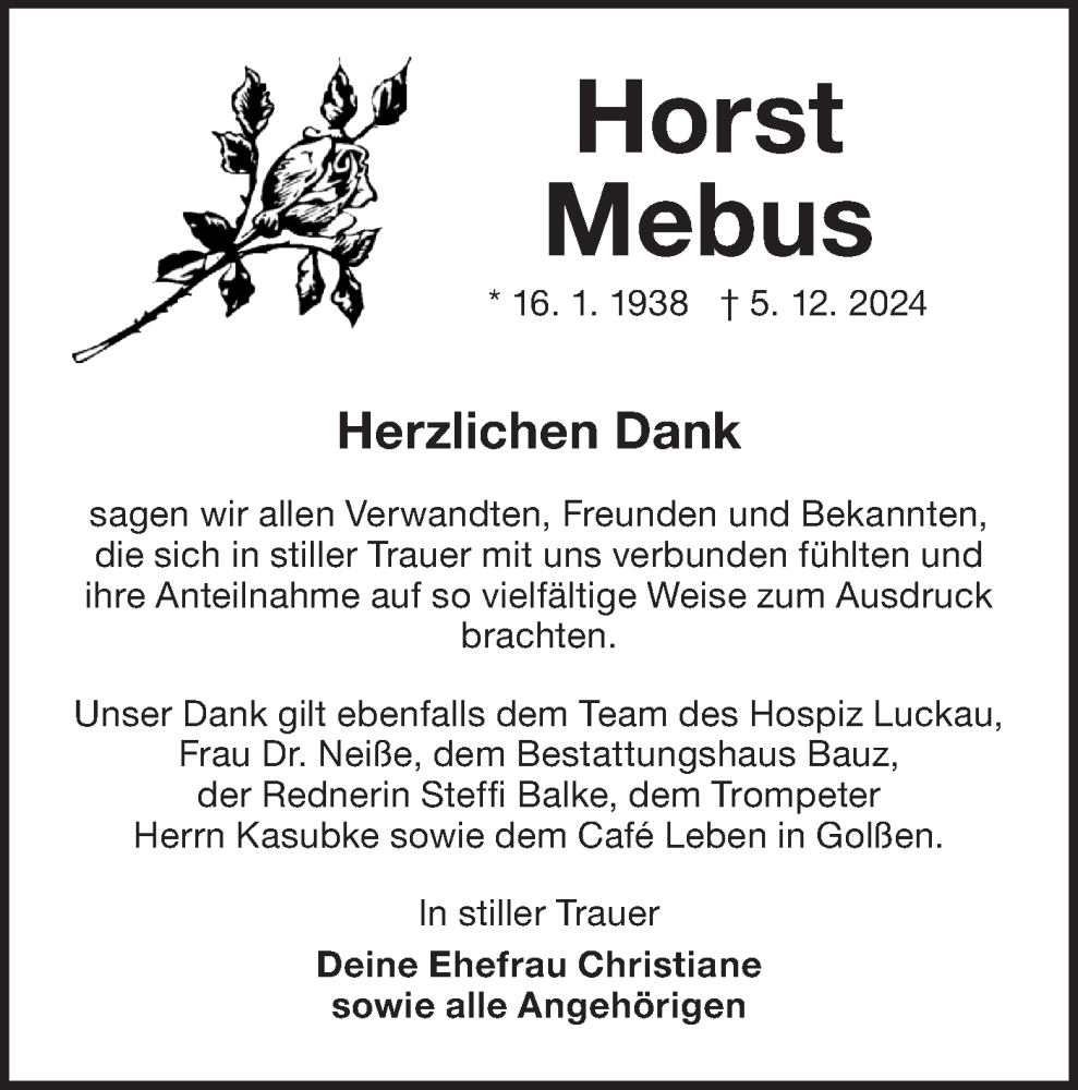 Hier finden Sie alle Traueranzeigen aus der Zeitung, die bisher für Horst Mebus erschienen sind. Weitere Traueranzeigen, die in der Zeitung erscheinen, werden hier ebenfalls aufgelistet