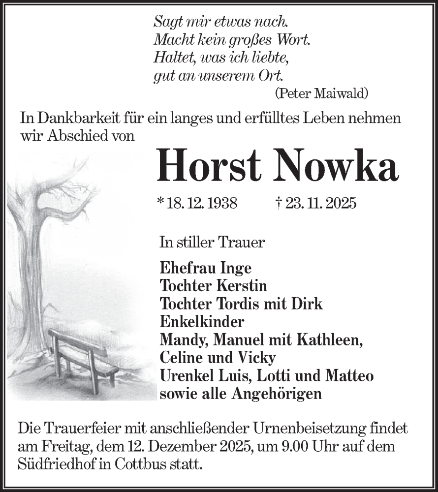 Hier finden Sie alle Traueranzeigen aus der Zeitung, die bisher für Horst Nowka erschienen sind. Weitere Traueranzeigen, die in der Zeitung erscheinen, werden hier ebenfalls aufgelistet