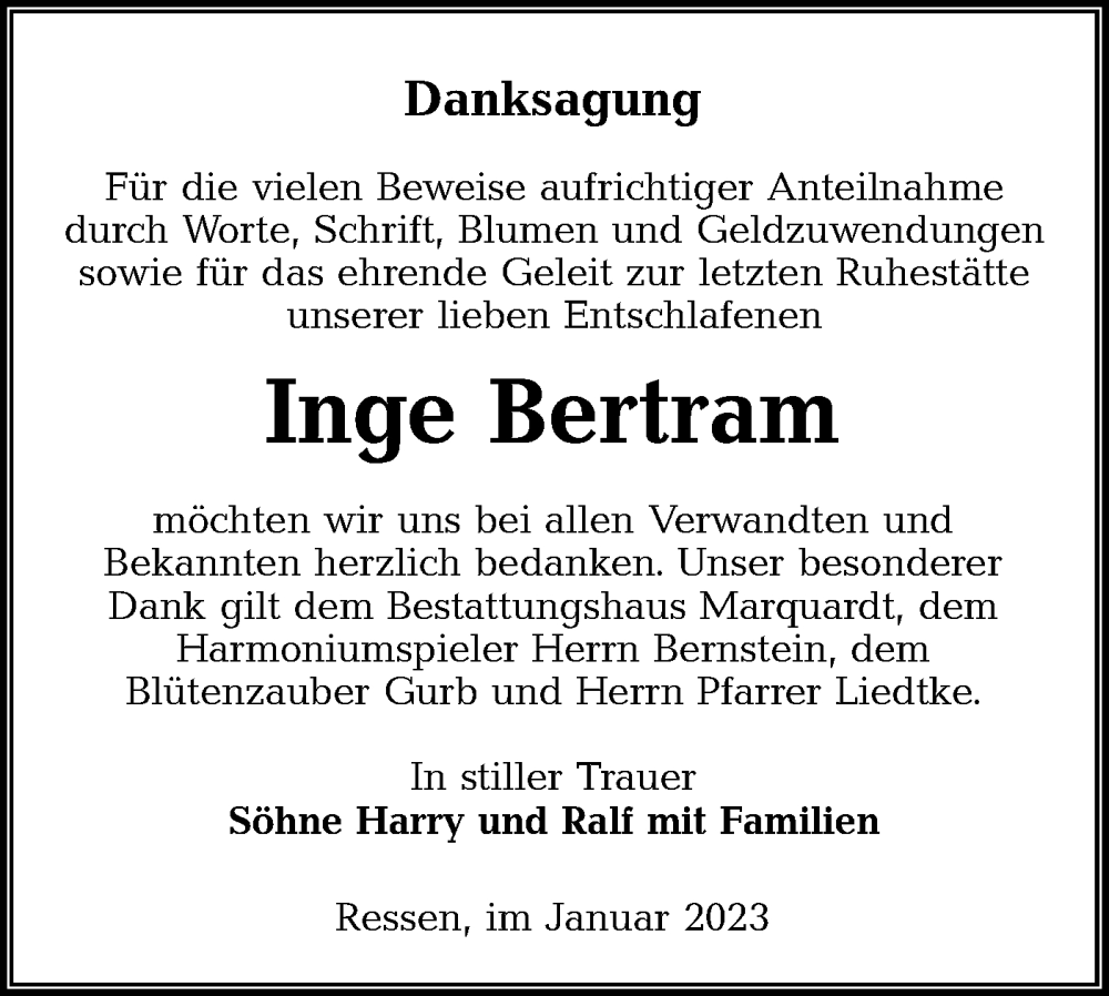 Hier finden Sie alle Traueranzeigen aus der Zeitung, die bisher für Inge Bertram erschienen sind. Weitere Traueranzeigen, die in der Zeitung erscheinen, werden hier ebenfalls aufgelistet