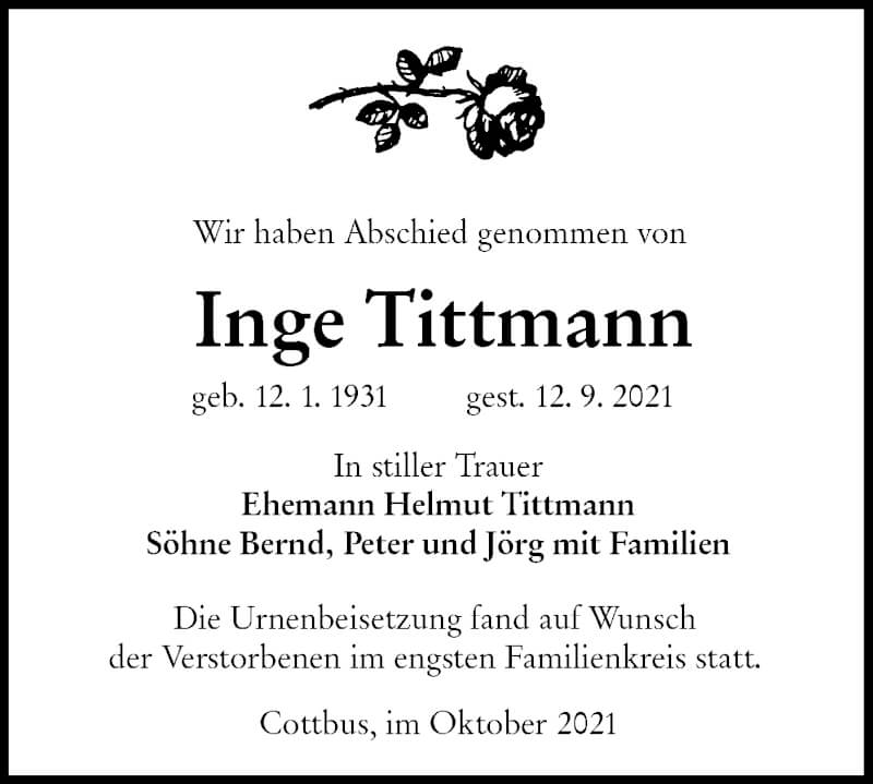 Hier finden Sie alle Traueranzeigen aus der Zeitung, die bisher für Inge Tittmann erschienen sind. Weitere Traueranzeigen, die in der Zeitung erscheinen, werden hier ebenfalls aufgelistet