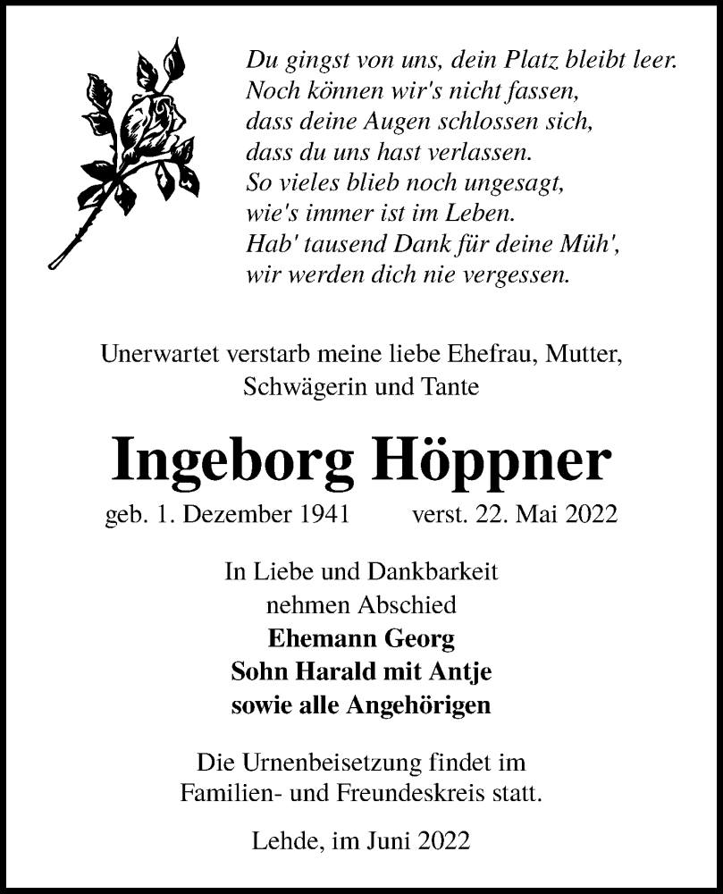 Hier finden Sie alle Traueranzeigen aus der Zeitung, die bisher für Ingeborg Höppner erschienen sind. Weitere Traueranzeigen, die in der Zeitung erscheinen, werden hier ebenfalls aufgelistet