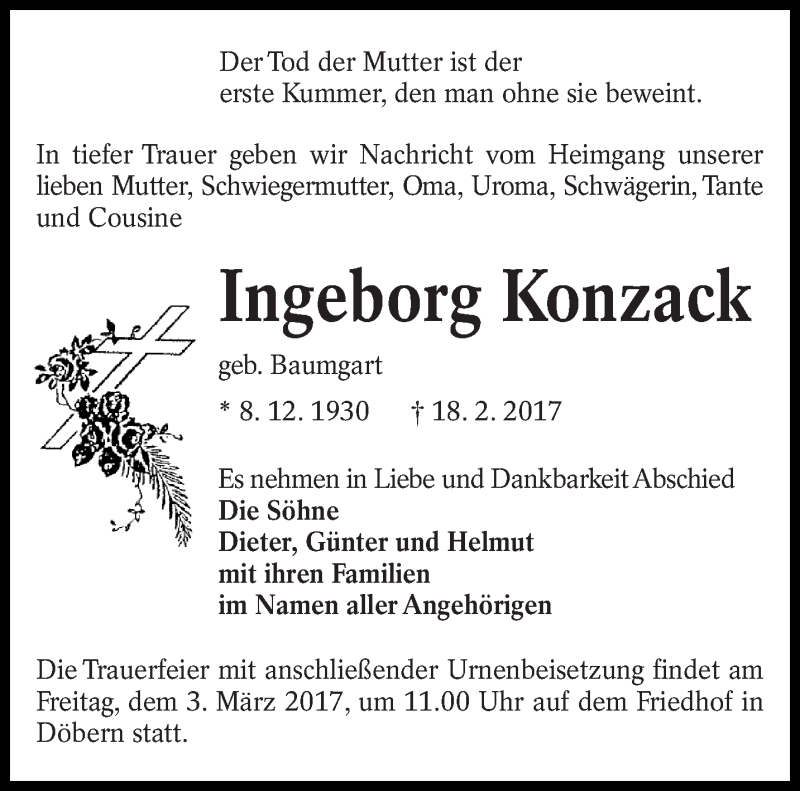 Hier finden Sie alle Traueranzeigen aus der Zeitung, die bisher für Ingeborg Konzack erschienen sind. Weitere Traueranzeigen, die in der Zeitung erscheinen, werden hier ebenfalls aufgelistet